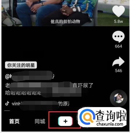 进入抖音首页之后,点击下面中间位置的+号。
