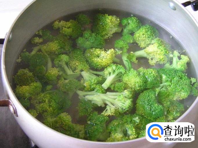 首先切去西兰花的底部,然后用手掰成小朵放入锅中,加入清水没过西兰花即可,开火加热至翻滚立即停火,泡上2~3分钟捞出备用。