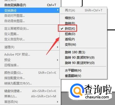 画出矩形之后再在编辑菜单里找打变换选项,点击该选项在其内找到斜切选项,如图所示: