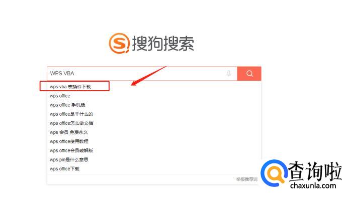 打开浏览器,在搜索框内输入“WPS VBA”,选择下拉菜单的第一个选项“wps vba 宏插件下载”。
