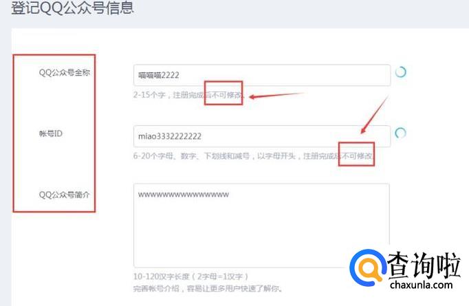 然后输入【QQ公众号的名称,ID账号,简介】,如下图所示:
