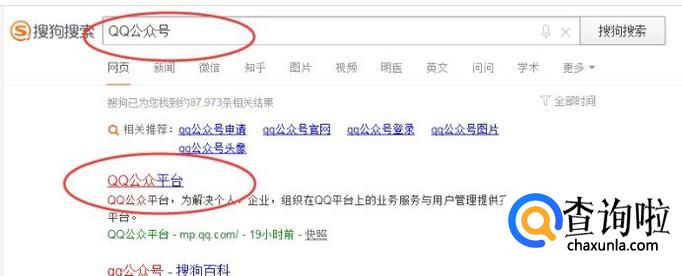 在浏览器搜索框中输入【QQ公众号】,然后点击第一个链接,如下图所示:
