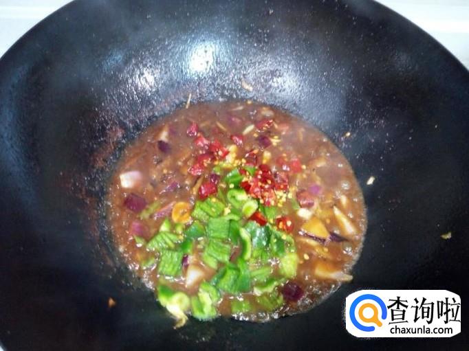 放入红干椒,青椒稍翻炒一下,随即放入炒好的茄子翻炒。