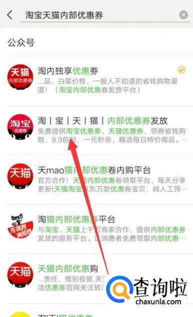 进入之后,搜索公众号“淘宝天猫内部优惠券”,点击并进入,如图所示。