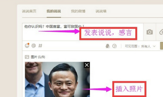 4、进去里面就可以见到很多发布动态的方式,比如说相册、说说、拍摄、签到等等,通常发布动态点击“说说”就可以了。