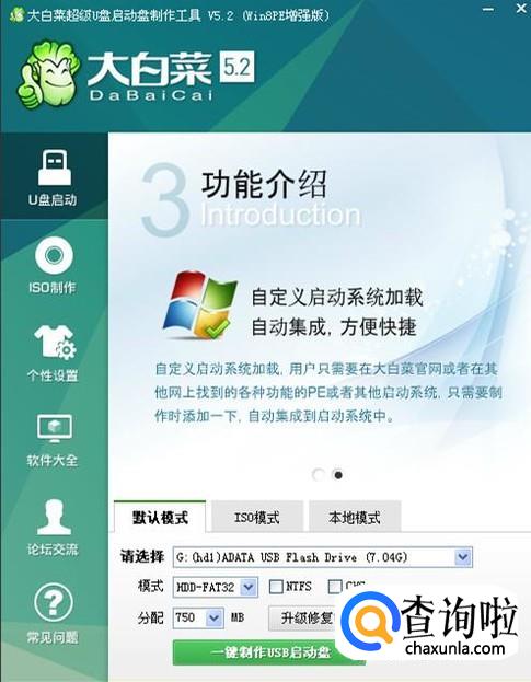 首先就是把U盘制作成启动盘。下载安装一个大白菜U盘启动制作工具,如图,点击下边的“一键制作USB启动盘”,在弹出的对话框上点“确定”,就会开始制作。