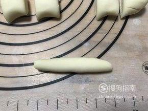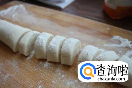 将发好的面团取出,揉搓成长条,揪成小剂子,就和包饺子的步骤一样。