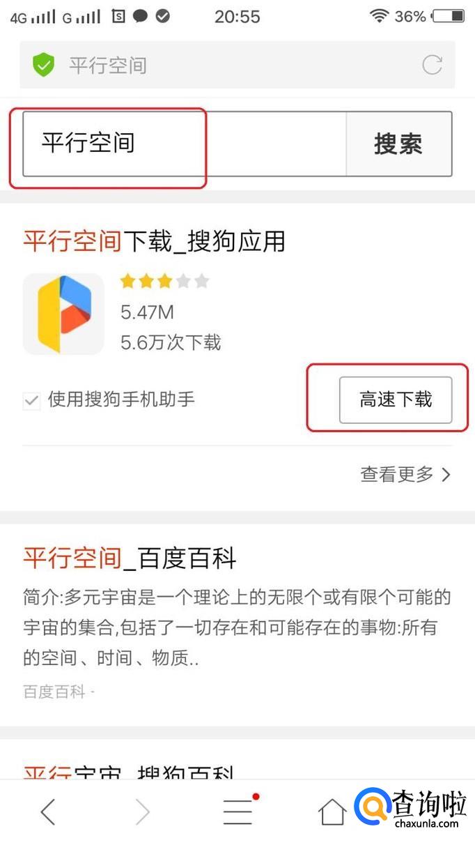 首先,我们需要在手机浏览器搜索并下载“平行空间”app,把它安装到自己的手机上。
