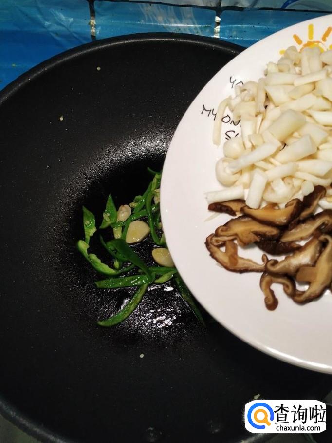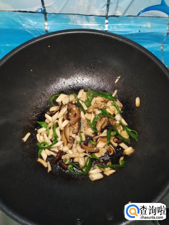 将准备好的海鲜菇和香菇也放入锅中,和青椒一起翻炒均匀。