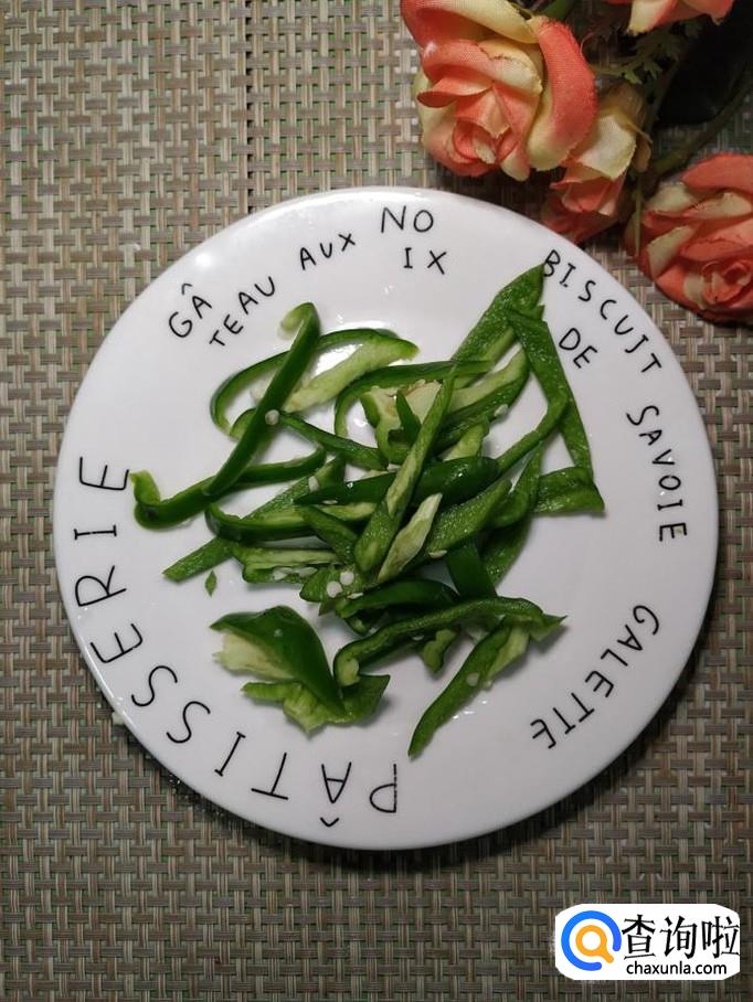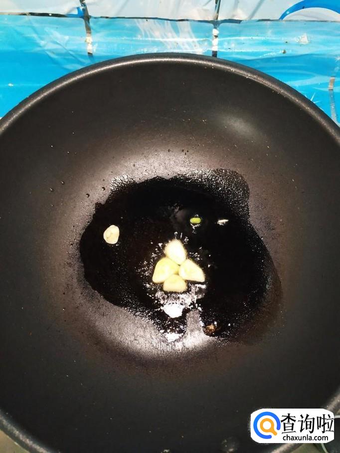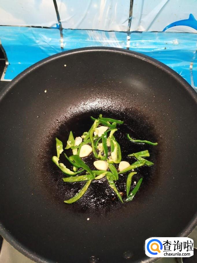 准备适量蒜,剥去外皮,切成片备用,炒锅中放入适量油,油热后将蒜片放入锅中炒香,然后将青椒丝放入锅中翻炒一下。
