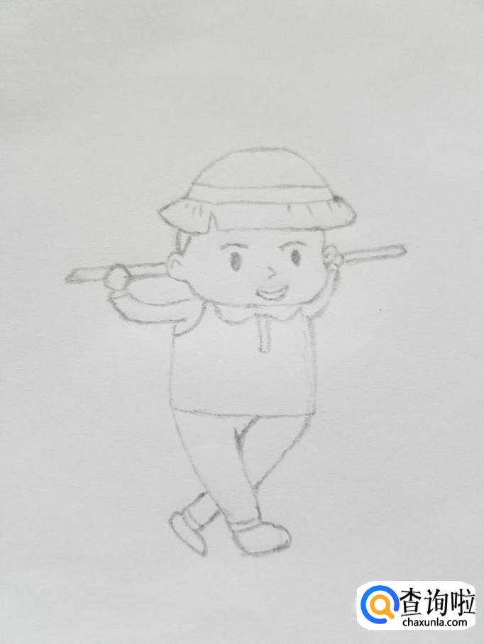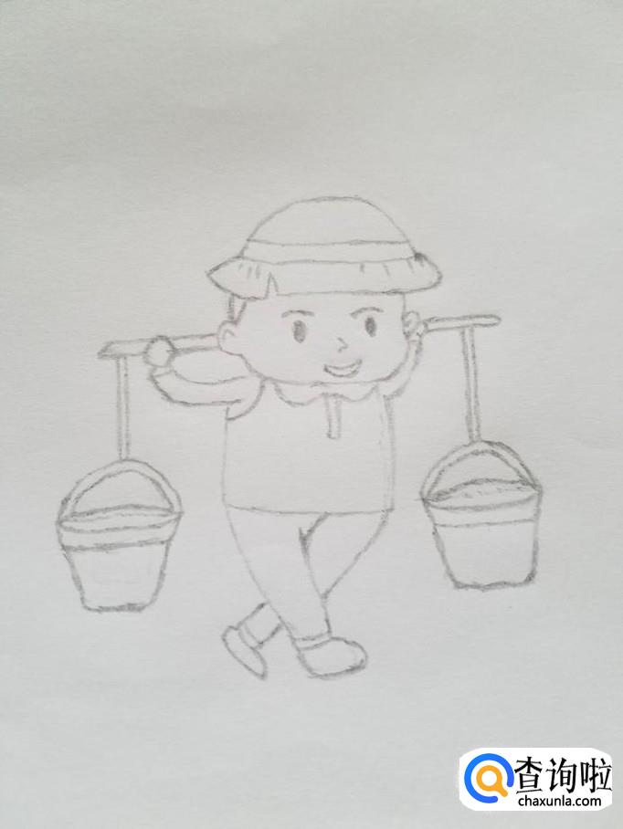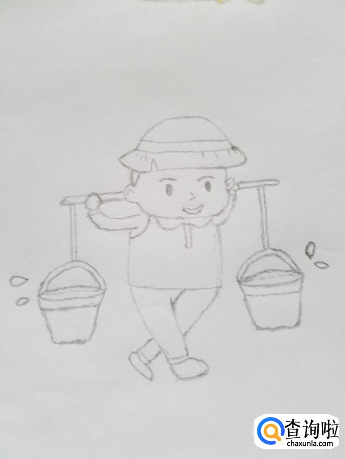 我们首先画出小男孩的整个轮廓和肩上的扁担。