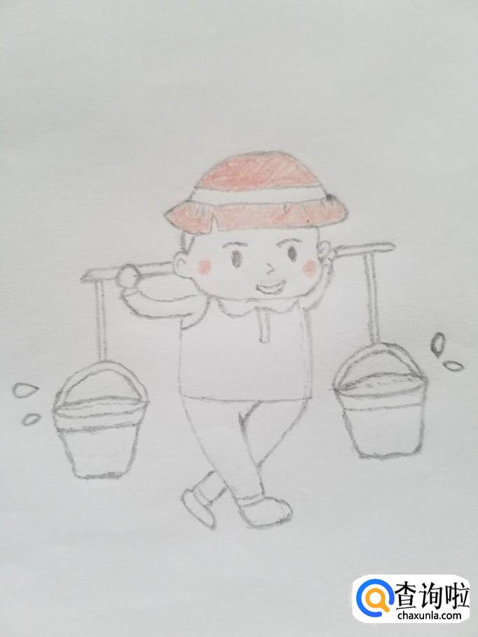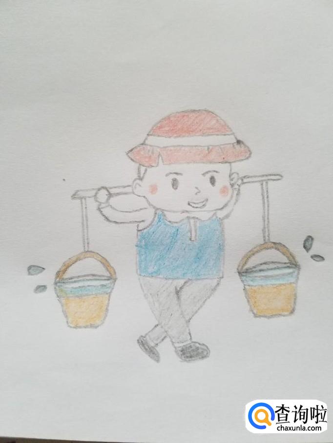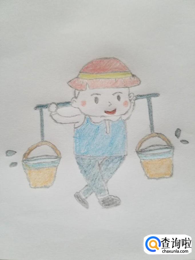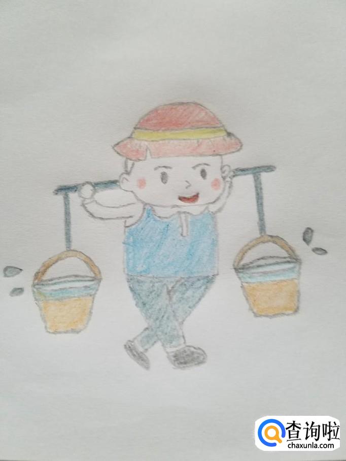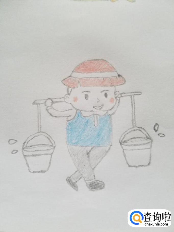 最后我们将帽子剩余部分涂成黄色,扁担涂成蓝色,裤子再涂一次蓝色。这样挑水的小男孩就完成了。
