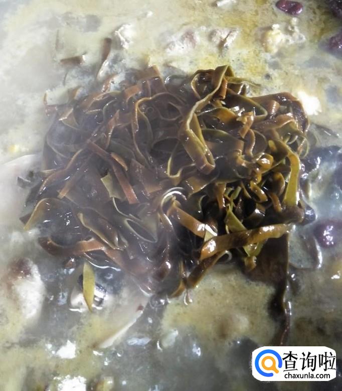 然后我们加入切成丝的海带,如下图所示,再慢火炖2个小时