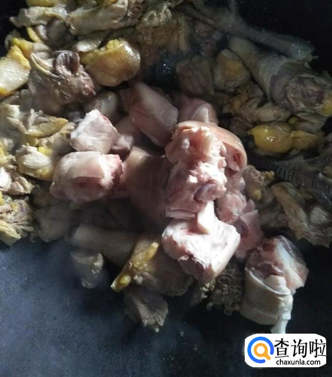 将鸡肉,猪脚倒入热锅中煎炒,不停的翻炒