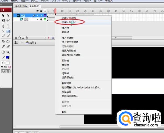 选择“遮罩图层”的任意一帧,右击执行“创建补间形状”,为其创建补间形状动画。