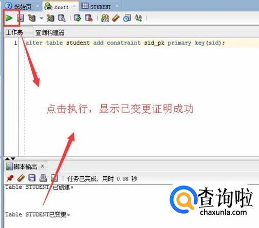 编写完约束添加语句以后,点击工具栏中的执行按钮,如下图所示,如果输出栏显示已变更则证明主键约束创建成果
