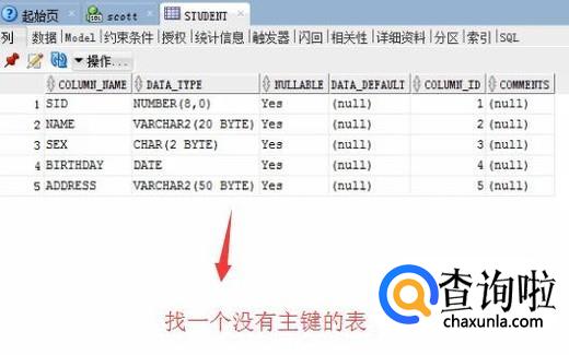 首先打开SQL Developer软件,找一个没有主键约束的表,如下图所示
