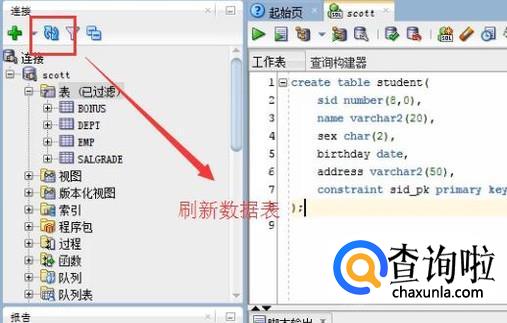 表创建完以后,记得在左侧刷新数据库信息,如下图所示,因为你创建的信息不刷新的话不会更新
