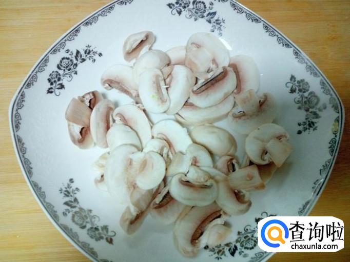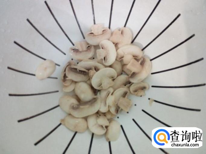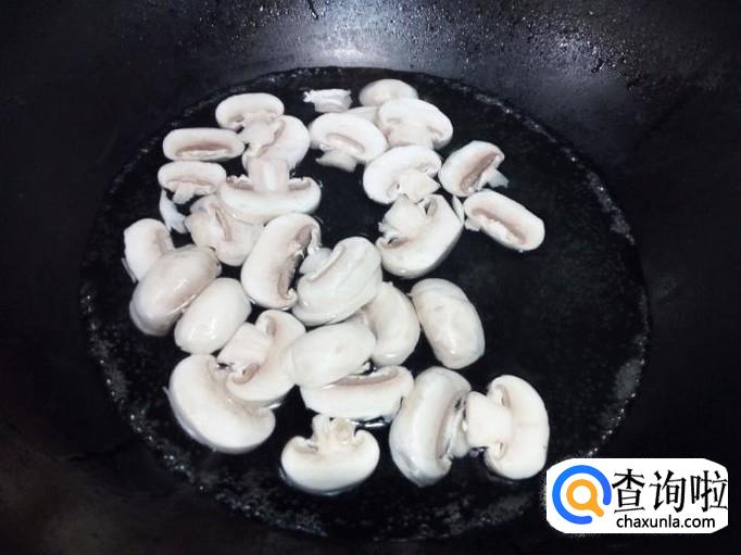 口蘑用水焯一下,水开后入锅10秒钟捞出,沥干水分。