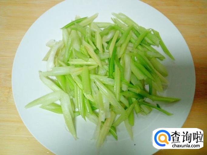 芹菜收拾清洗干净,控干水分,切成寸段。