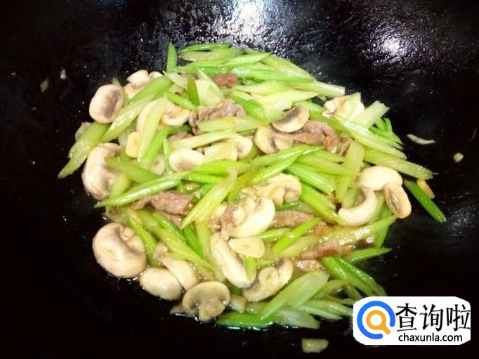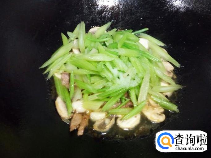 口蘑略翻炒一下,放入芹菜翻炒,放入盐,炒至芹菜断生,放入味精,关火出勺。