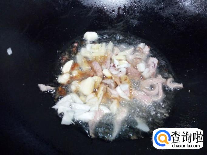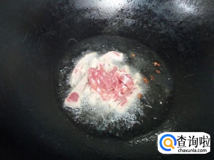 锅里放入油加热,油热后放入花椒爆锅,放入肉翻炒。
