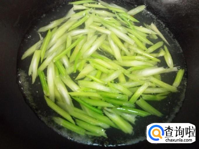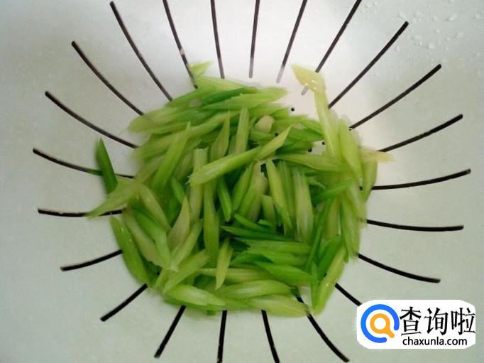 芹菜用水焯一下,水开后入锅10秒钟捞出,迅速用冷水过凉,沥干水分。