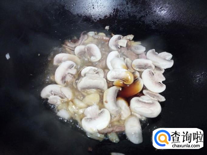 炒至肉颜色微白,放入葱,姜,蒜翻炒,放入少许酱油。随即放入口蘑翻炒,放入料酒,一小匙儿蚝油。