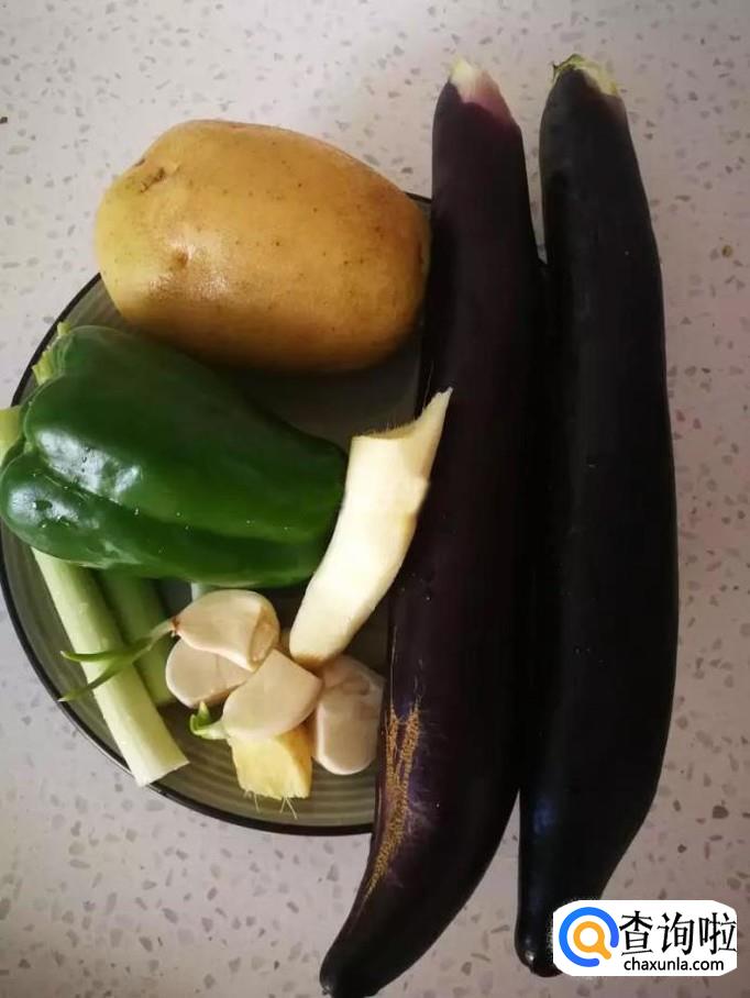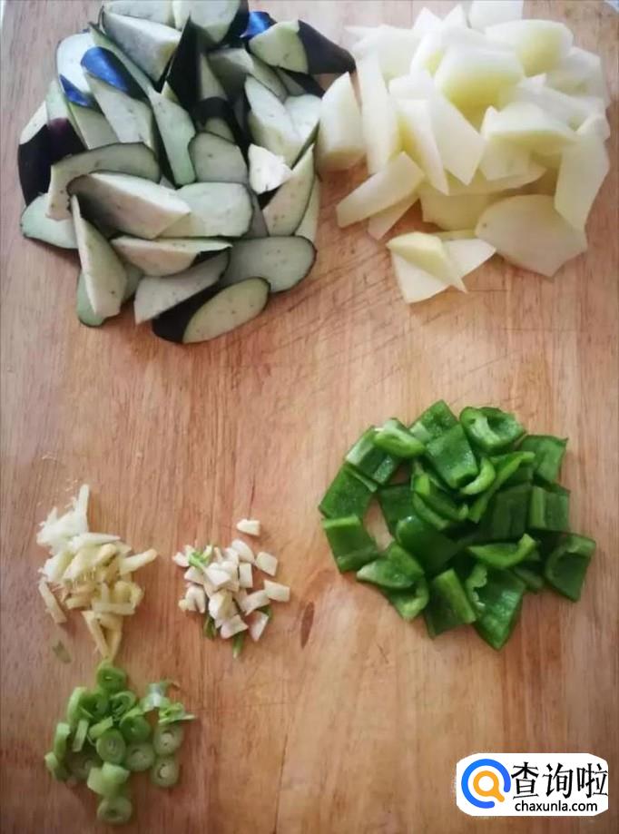 清洗干净后,将土豆、茄子切成圆块状的,辣椒切成方状的,葱、姜、蒜都切小放那。