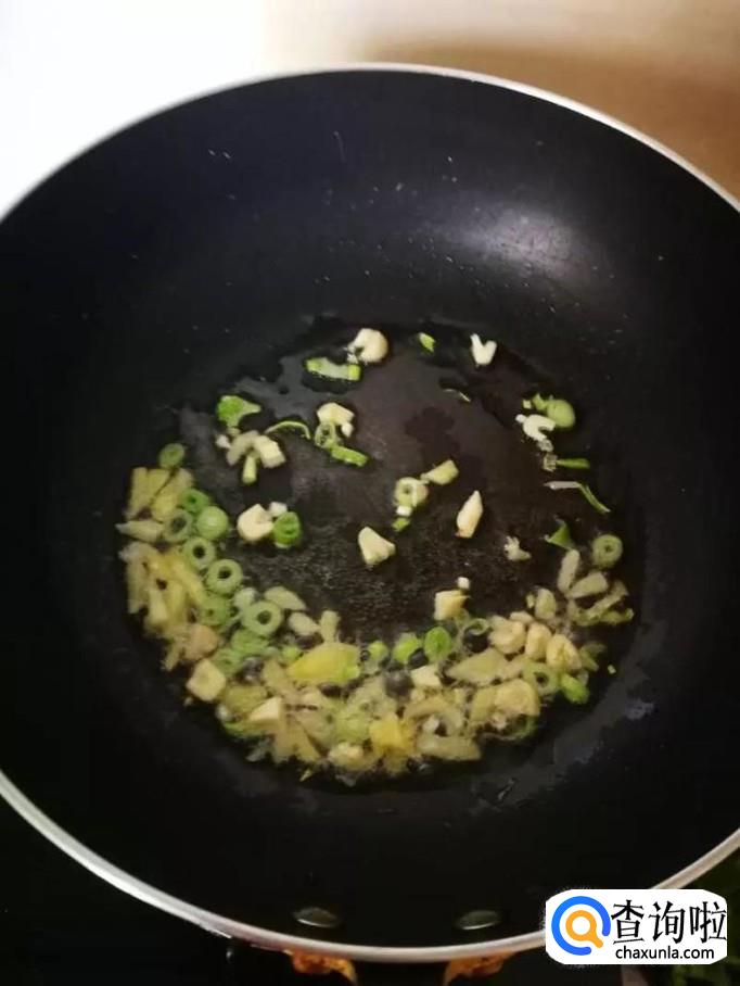 以上两个步骤结束后,接下来,用热锅温油,放入葱、姜、蒜煸香。然后,我们加入少量的胡椒粉、蚝油,1勺盐,1勺味极鲜,待炒出香味后,我们加入少半炒勺汤。
