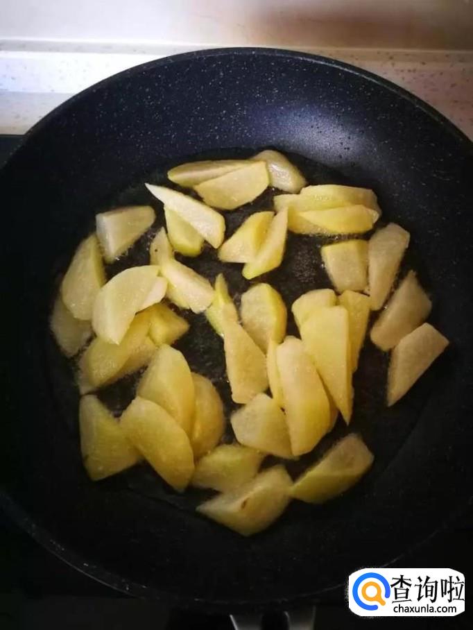 将平底锅烧热,在锅底少放一层油烧热后,将土豆倒进来将其受热均匀,待土豆煎到里外透明,外表稍硬、四边呈金黄色了即可盛出。