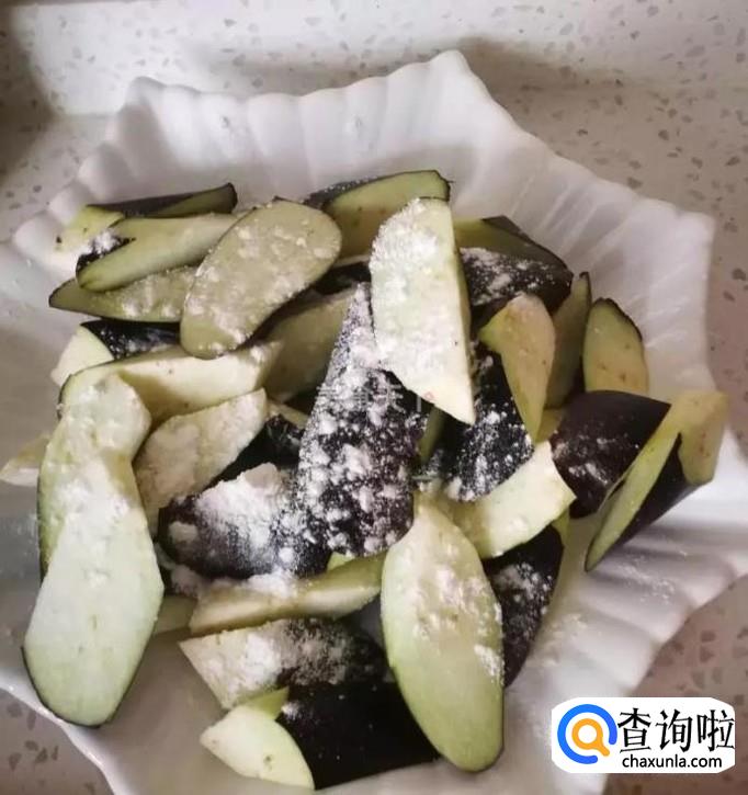 在茄子上撒少量的面粉拌匀,面粉不要太多。