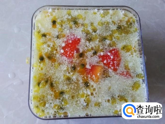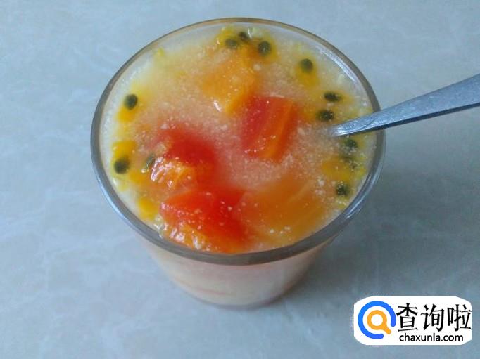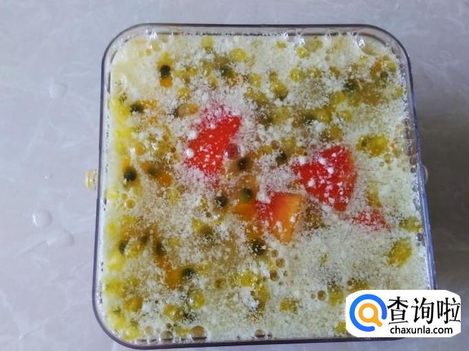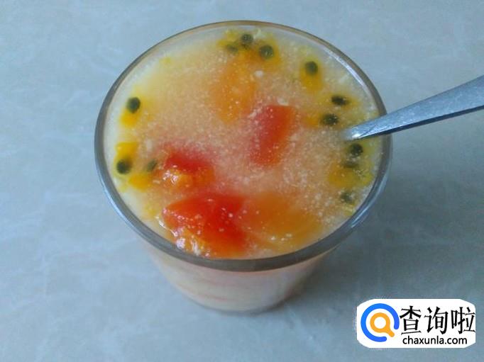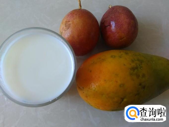 鲜奶1杯,熟透的木瓜100克,百香果2个,白糖适量。