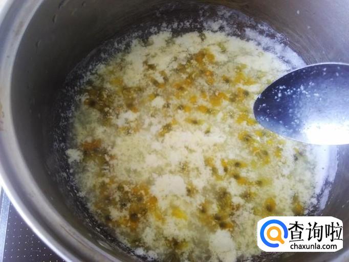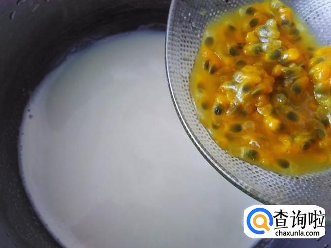然后把百香果倒进去搅拌均匀,鲜奶和酸性的食物混合一起马上变成蛋花状,然后再煮沸就可以熄火了,晾凉备用。