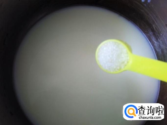 鲜奶放到小锅里加适量的白糖用小火煮沸。