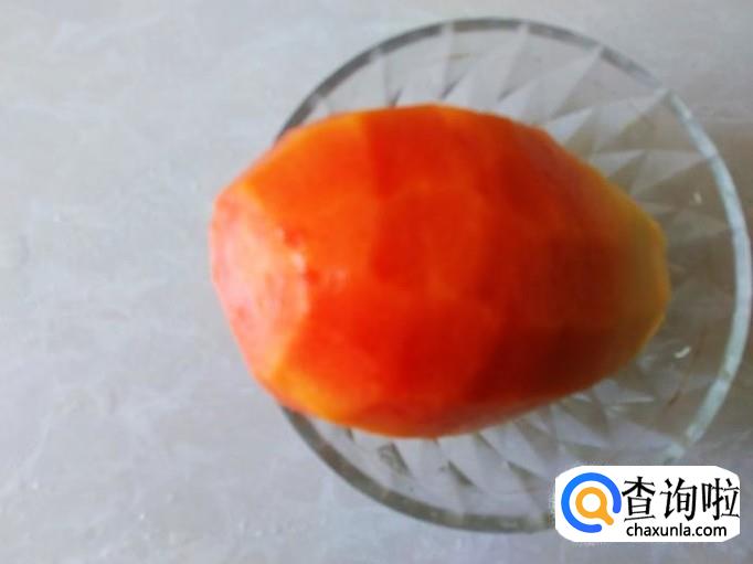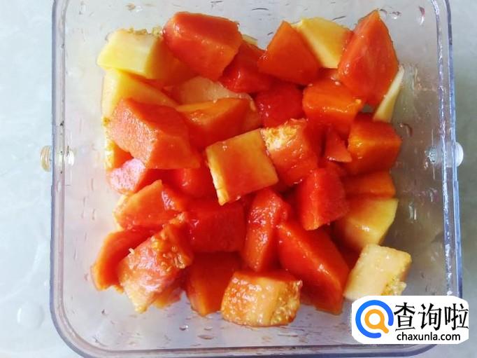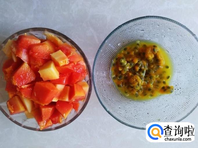 首先把木瓜去皮去籽,然后切成小丁,百香果切开,然后用勺子把里面的果肉挖出来放置碗里备用。