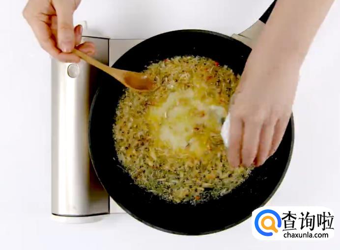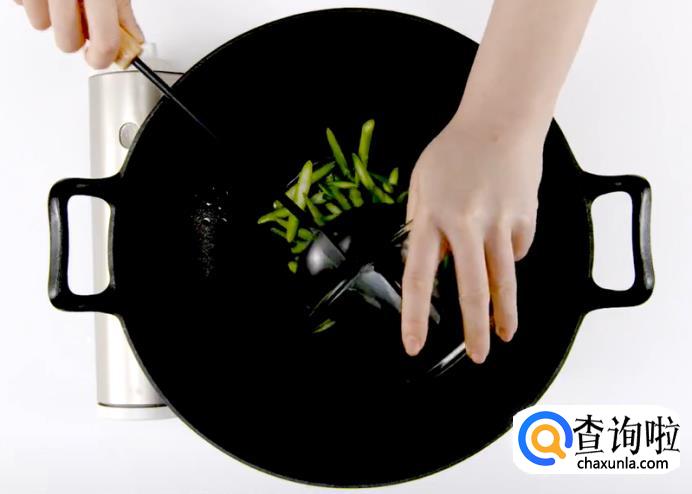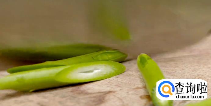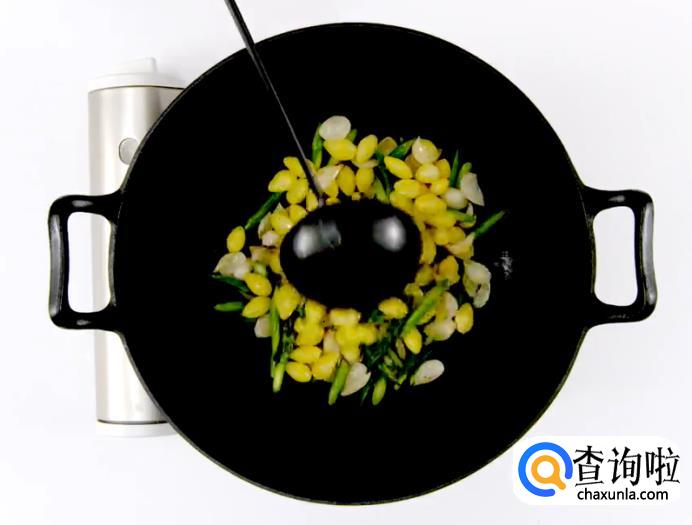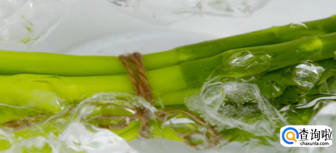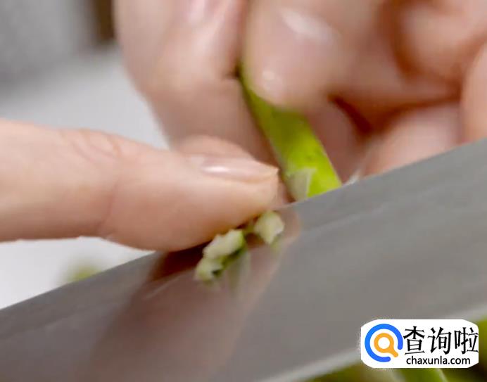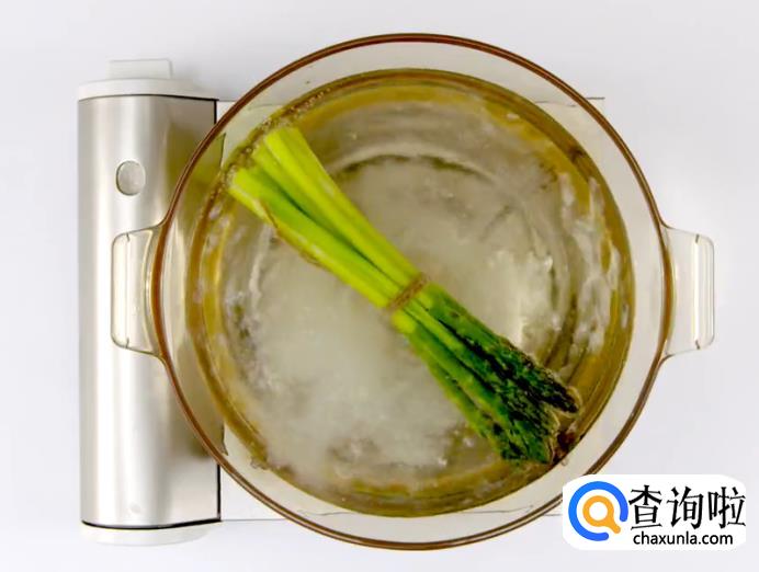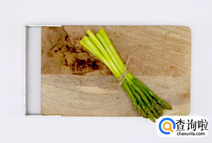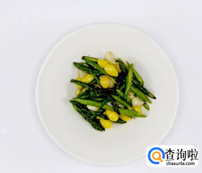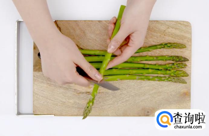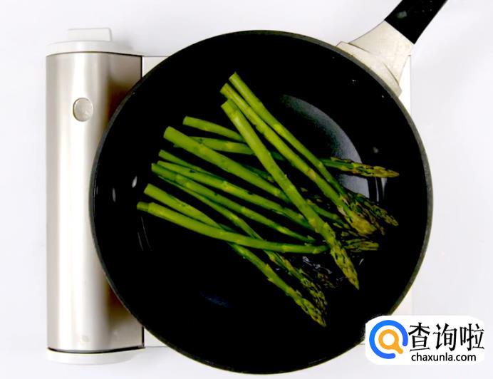首先把芦笋下油锅,煎熟备用(芦笋需去除鳞片)。