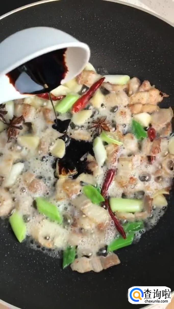 然后往锅中加入适量的酱油和豆瓣酱,如下图所示。