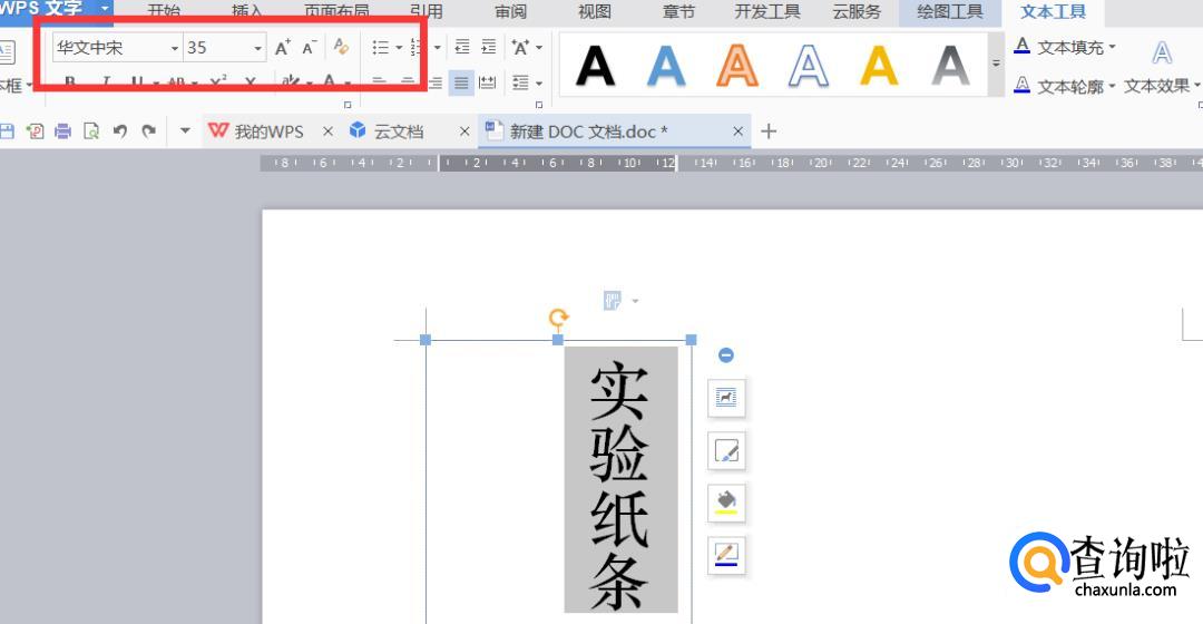 录入“实验纸条”,选择字体为“华文中宋”,字号为35。