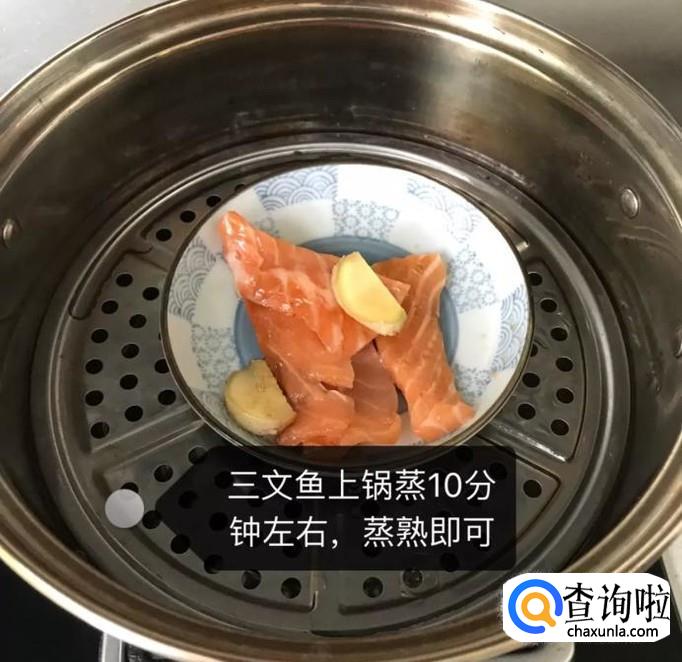 接着将三文鱼上锅蒸十分钟左右,如下图所示。