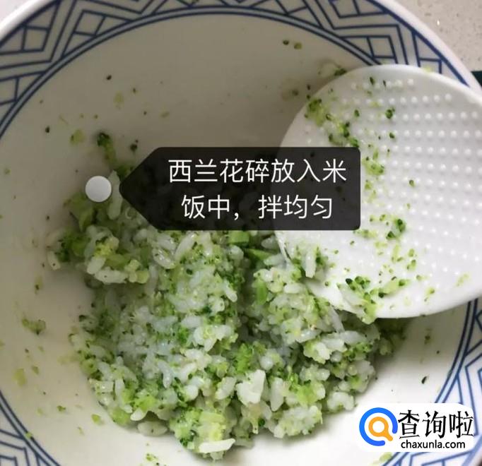然后把剁碎的西兰花放入米饭中搅拌均匀,如下图所示。