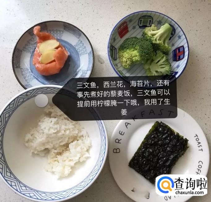 首先准备好要用到的三文鱼、西兰花、海苔片、还有事先煮好的藜麦饭,三文鱼可以提前用柠檬腌制一下。