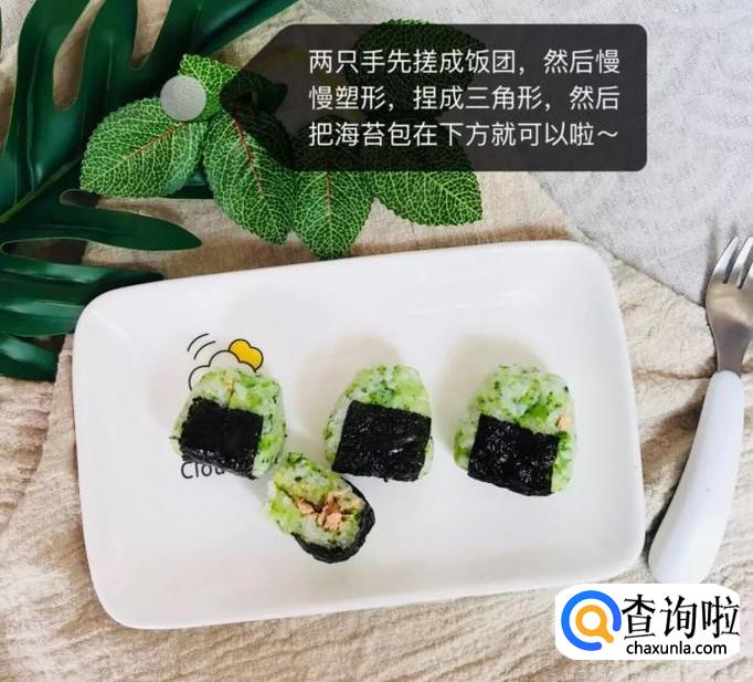 接着用两只手先搓成饭团,然后慢慢整型,捏成三角形,之后把海苔包在下面就可以了。一道美味可口的三文鱼夹心饭团就做好了,希望大家能够喜欢。你学会了吗?赶快动手试一试吧。