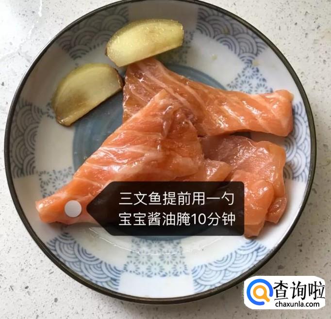 接着往三文鱼中加入一勺的酱油再次腌制十分钟,如图所示。小贴士:如果是做给小宝宝吃的,可以用等量的宝宝酱油替代酱油。