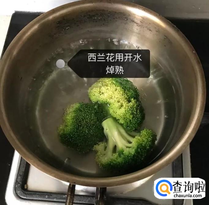 然后锅中放入适量的清水,待水烧开,倒入西兰花焯一分钟,如下图所示。