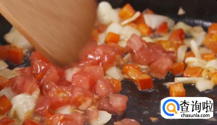 接下来开大火,在平底锅内倒入适量橄榄油,下洋葱和蒜片煸香,接着加甜椒粒和番茄粒,炒到出汁。
