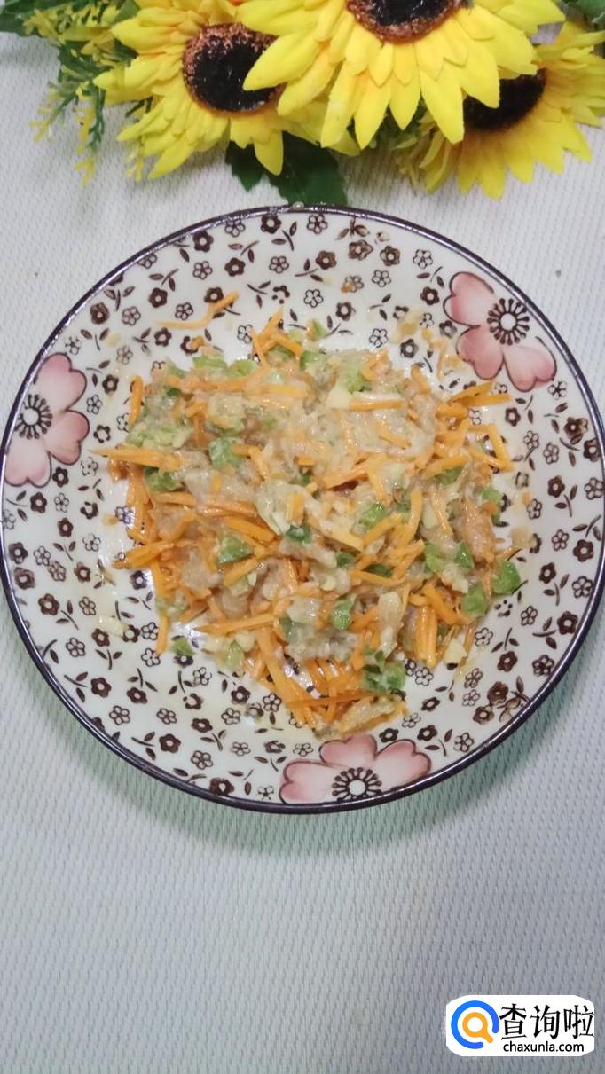 将胡萝卜洗净后,切碎放入盘中,和鸡胸肉放在一起,搅拌均匀,腌制15分钟左右。