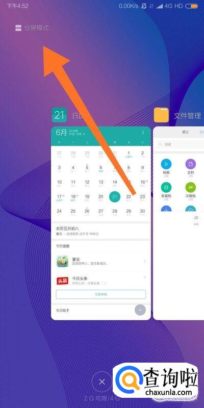 首先从手机桌面底部上滑,呼出多任务界面。然后点击进入左上角的“分屏模式”。