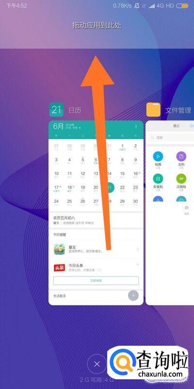 进入“分屏模式”后,拖动需要分屏运行的一个应用程序至屏幕上方。