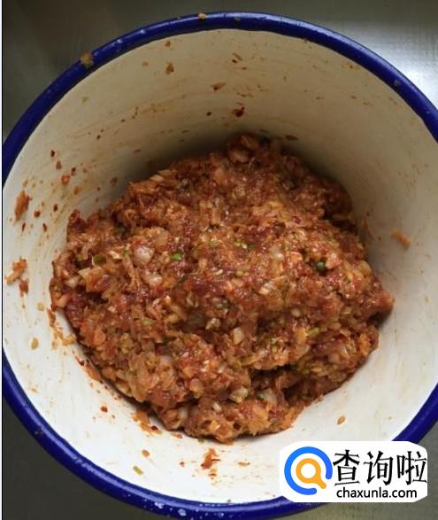 将肉馅加到准备好的辣白菜馅里,搅拌均匀,一般不需要另外加盐。
